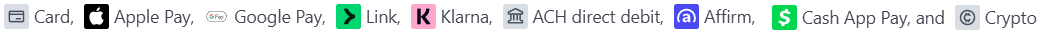 Powered by: Access to view or manage; pause, cancel, amend, subscriptions, payment plans & billing methods 24/7 via your personal Stripe PortalFlexible Payment methods: Card, Apple Pay, Google Pay, Link, Klarna – Buy now pay later, ACH direct debit, Affirm – Buy now pay later, Cash App Pay & Crypto!
